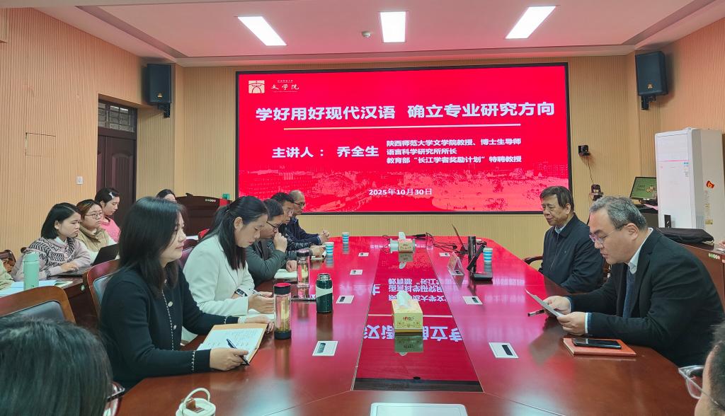 2025年10月30日上午,教育部“长江学者奖励计划”特聘教授、陕西师范大学乔全生教授莅临文学院,以《学好用好现代汉语,确立专业研究方向》为题开展学术讲座。讲座由文学院副院长张言军主持,汉语教研室部分教师及汉语言文学专业100余名本科生共同聆听,现场氛围浓厚。