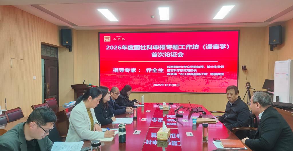 2025年10月30日下午,教育部“长江学者奖励计划”特聘教授、陕西师范大学乔全生教授应邀出席文学院“2026年度国社科项目申报专题工作坊(语言学)首次论证会”。本次工作坊严格对标我校国社科项目“四级论证”体系要求,聚焦语言学领域国社科项目申报中的实际问题,为汉语教研室教师提供精准指导。论证会由文学院副院长张言军主持,汉语教研室教师全程深度参与,现场研讨聚焦问题、务实高效,学术交流氛围浓厚。