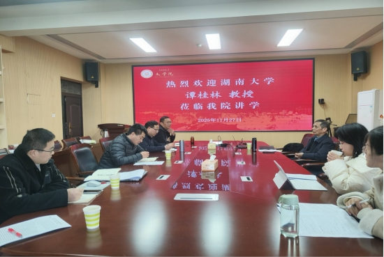 11月27日,湖南大学谭桂林教授受邀走进我校文学院,在三楼会议室带来题为“鲁迅中年意气与晚年情怀——漫谈鲁迅文学中的寻根叙事”的学术讲座。本次讲座由文学院副院长徐洪军主持,学院部分骨干教师及2024级、2025级学术型硕士研究生共同参与,现场学术氛围浓厚,交流互动热烈。