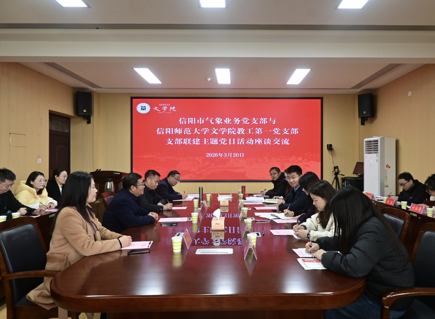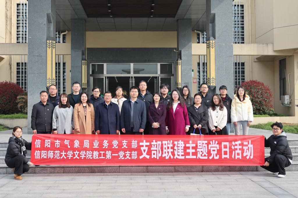 3月20日,文学院教工第一党支部与信阳市气象局业务党支部联合开展“守牢安全底线践初心 深耕淮域文脉担使命”主题党日活动。信阳市气象局党组书记、局长于庆学,党组成员、副局长胡玉梅,文学院党委书记周贤亮等参加活动。